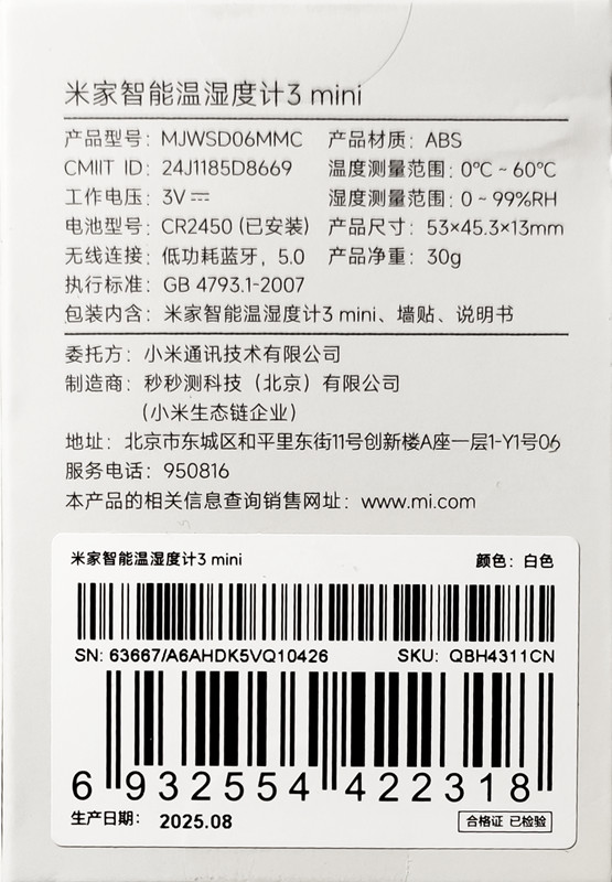 Mijia Smart Temperature and Humidity Monitor 3 Mini, BLE, Model: MJWSD06MMC